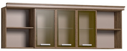 Технические характеристики: Крепится на стену за подвесы. Ручки из массива дерева. Выдерживает нагрузку до 40 кг. Навесной шкафчик с двумя открытыми отделениями и тремя за стеклянными тонированными фасадами. Стеклянные полки выдерживают до 2 кг каждая. Шкаф декорирован составным карнизом.