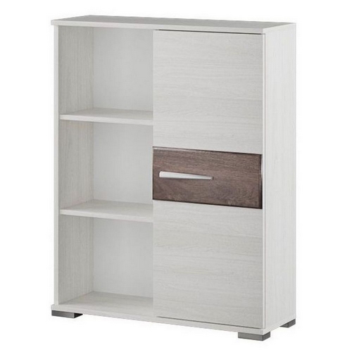 Особенности Шкафа-пенала универсального Акита: Низкий шкаф с дверцей и открытыми полками. Закрытое отделение с дверцей оснащено двумя полками.