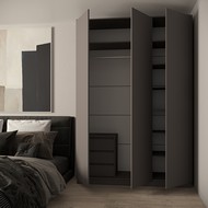 Технические характеристики: Шкаф распашной Мика 1500 (графит) - идеально впишется в гостиную, спальню или прихожую. Платяной шкаф комплектуется металлической штангой для вешалок, полками для хранения и выдвижными ящиками. Дверцы шкафа без ручек, распашные. Система открывания дверей нажатием (push-to-open). Направляющие ящика шариковые, полного выдвижения.