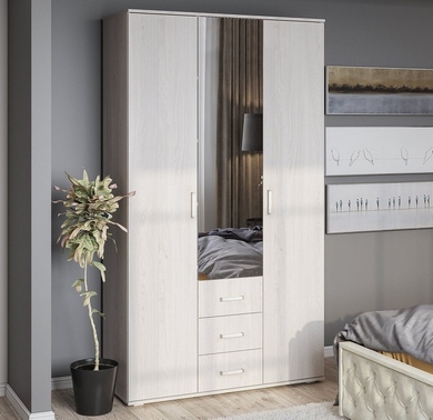Дополнительно: Трехдверный шкаф из коллекции мебели Белла отличается продуманным разноплановым наполнением. Комплектация модуля включает стационарную штангу, комплект полок и 3 выкатных ящика на роликовых направляющих. Всей Вашей одежде на плечиках, в сложенном виде, а также аксессуарам и текстилю хватит места. Шкаф выполнен в приятном декоре "ясень белый" с имитацией текстуры дерева. Зеркало на центральном фасаде визуально облегчает конструкцию шкафа и освежает окружающую обстановку. Зеркальное полотно на фасаде. Разноплановое наполнение - комплект полок, штанга и ящики. Роликовые направляющие. Надежные опоры.