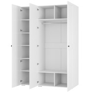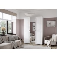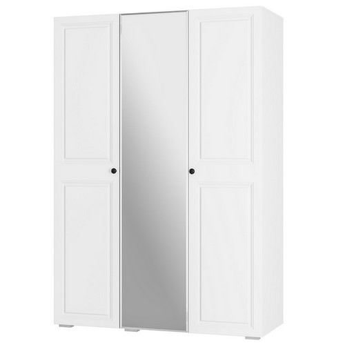 Особенности: корпус ЛДСП, белый, фасад МДФ, эмаль белая, задняя стенка - ЛДВП, белая 0,4 мм, кромка ПВХ пластик 0,7 мм, опоры подпятник, пластик, петли створок накладные, зеркальный фасад с фацетом, в комплекте стационарная штанга и комплект полок, ручки металл, max нагрузка на полку/штангу - 10 кг