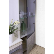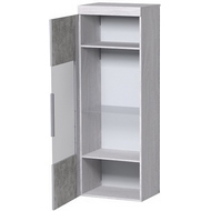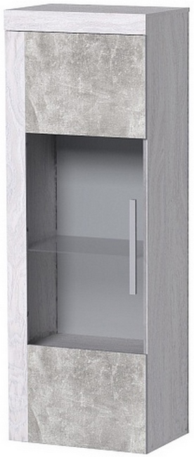 Технические характеристики: Сборка лево/правосторонняя. Внутри шкафа расположены 3 полки (1 стеклянная, 2 ЛДСП). Нагрузка на 1 стеклянную полку до 10 кг, на полку ЛДСП до 15 кг. Полки регулируются по высоте. Дверь шкафа со стеклянной вставкой. Стекло вставки - тонированное серое. Дополнительно к шкафу можно приобрести подсветку. Актуальный и современный декор фасадов "под бетон". Ручка выполнена из массива дерева и окрашена в серебристый цвет. Регулируемые опоры позволяют компенсировать незначительные неровности пола. Шкаф крепится к стене за подвесы. Поставляется в разобранном виде.