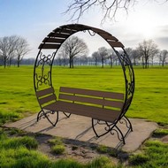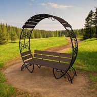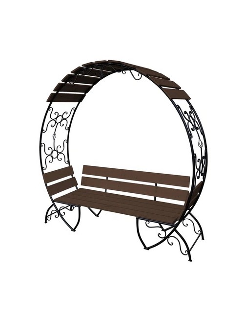 Технические Технические зарактеристики: Сборно-разборная конструкция. Скамейка декорирована аркой с коваными элементами. Металлический каркас покрыт специальным порошковым покрытием, которое делает металл устойчивым к коррозии и погодным условиям. Деревянные элементы покрыты морилкой (темный орех). Поставляется в разобранном виде.
