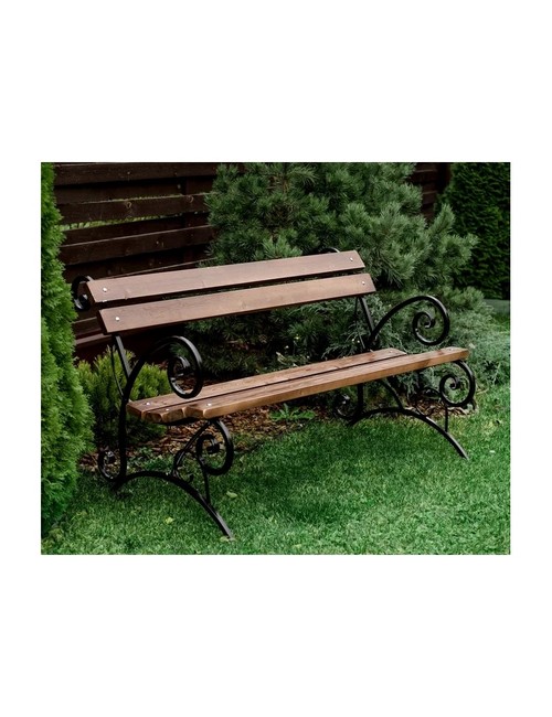 Технические Технические зарактеристики: Сборно-разборная конструкция. Скамейка декорирована коваными элементами. Металлический каркас покрыт специальным порошковым покрытием, которое делает металл устойчивым к коррозии и погодным условиям. Деревянные элементы покрыты морилкой (темный орех). Поставляется в разобранном виде.