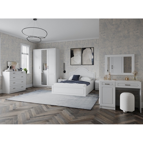 Комплектация: Шкаф 3-х створчатый Апполия (Н143276) Зеркало Апполия (00-00143064) Комод с 5 ящиками Апполия (Н143270) Корпус кровати 1,4 Апполия (00-00143072) Ортопедическое основание для кровати 1,4 с подъемным механизмом и ящиком (00-00026463) Стол косметический (Н143272) Тумба прикроватная (Н143274) - 2 шт