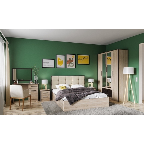 Особенности Спальни Лирика: Комплект состоит из двуспальной кровати, двух тумб, туалетного столика с зеркалом и четырехдверного шкафа. Четкие геометрические формы и минималистичный дизайн. Матрас не входит в комплект и приобретается отдельно.