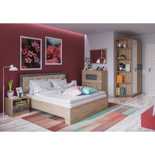 Особенности Спальни Мадлен: Мебель выполнена из ЛДСП в декоре дуб сонома и украшена вставками из МДФ цвета дуб шале серебро. Мягкое изголовье кровати обтянуто экокожей со строчкой и декоративными пуговицами. Кровать комплектуется основанием, матрас приобретается отдельно. Актуальный стиль. Универсальная цветовая гамма. Изящная фурнитура. Комбинированные зеркалом фасады шкафов. Разноплановое наполнение модулей.