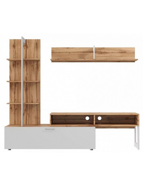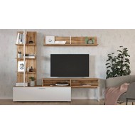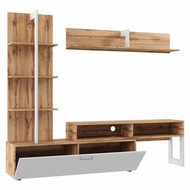 Ширина, см: 205,1. Высота, см: 173,7. Выступ, см: 41,6. Вес (кг): 57. Компоненты, входящие в комплект: полка навесная:, 1 полка, стеллаж:, 3 полки, тумба под ТВ:, 1 дверца, 2 полки. Стиль: модерн. Страна-производитель: Россия. Объем (м3): 0.1. Основной цвет: разноцветная. Материал фасада: ЛДСП Е1. Материал корпуса: ЛДСП Е1. Тип поверхности корпуса: матовый. Место размещения: Пол. Помещение: Гостиная. Гарантия (месяц): 24. Основное помещение: Гостиная. Цвет корпуса: дуб вотан. Цвет фасада: белый.