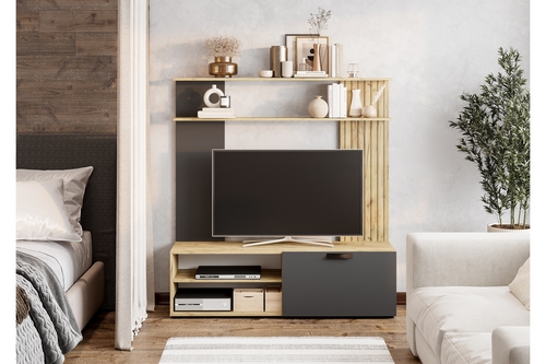 Особенности: Стенка Мишель 1 ГС-05 - благодаря своей универсальной конструкции станет стильным и функциональным решением для интерьера гостиной. Гостиная стенка, выполненная в цвете крафт в сочетании с темным оттенком графит, идеально впишется в любой стиль оформления. Стенка состоит из тумбы под ТВ с открытыми полками и шкафчиком с глухим откидным фасадом со стильной накладной ручкой из АБС-пластика и двух навесных полок. Место под ТВ - 75,8х80х33,4 см. Прочные регулируемые опоры с высотой 2 см. Стенка выполнена из ЛДСП, что обеспечивает его долговечность и надежность. Дверца оснащена накладными петлями. Максимальная нагрузка на полку, на вязку - 10 кг. Реальный цвет товара может отличаться от цвета товара на фотографии. Можно компоновать с другими модулями из серии мебели Мишель.