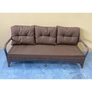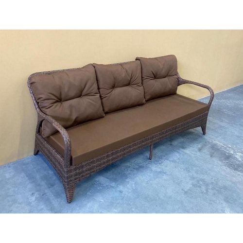 Технические характеристики: Трехместный плетеный диван с подушками. Прочный металлический каркас с плетением из искусственного ротанга. Подушки оснащены съемными чехлами кофейного цвета. Не боится солнца, дождя и перепадов температур. Идеальный вариант для дачи, сада, уличного кафе.
