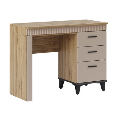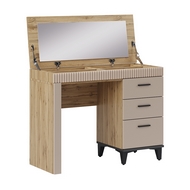 Особенности: Туалетный столик Дюна с откидной крышкой зеркалом - это стильное и практичное решение для интерьера спальни, а также для прихожей или гостиной комнаты. С закрытой столешницей может использоваться как небольшой письменный или рабочий стол. Каркас туалетного столика оформлен в древесном декоре, а фасад в кофейном оттенке и фрезеровкой в вертикальную полосу. Столик имеет удобный органайзер под откидной крышкой и три выдвижных ящика для хранения косметики, украшений и других предметов. Для плавного открывания и закрывания, ящики оснащены шариковыми направляющими полного выдвижения. Регулируемые опоры позволяют надежно установить комод на любой поверхности. Каркас выполнен из ЛДСП Дуб Вотан 16 мм, а фасады из МДФ 16 мм Каир. Можно компоновать с другими модулями из серии мебели Дюна. Возможна правосторонняя и левосторонняя сборка туалетного столика.