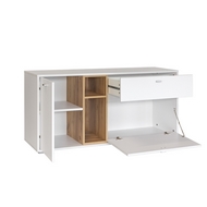 Особенности: Тумба Бэль 10.91 (белая, дуб золотой) состоит из выдвижного ящика, полок с распашной и откидной дверцами и отрытыми нишами. Тумба имеет необычное цветовое решение - корпус и фасады выполнены в белом цвете, а открытые ниши в контрастном цвете дуб крафт золотой. Она изготовлена из ЛДСП, который отличается высокой износостойкостью и устойчивостью к механическим повреждениям. Распашная дверца на четырехшарнирных петлях, а горизонтальная откидная дверца на газлифтах. Выдвижной ящик оснащен шариковыми направляющими. На фасадах установлены ручки из ABS пластика в цвете сатин. Можно компоновать с другими модулями из серии мебели Бэль. Реальный цвет товара может отличаться от цвета товара на фотографии. Поставляется в разобранном виде.