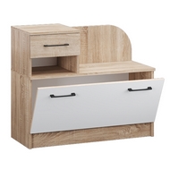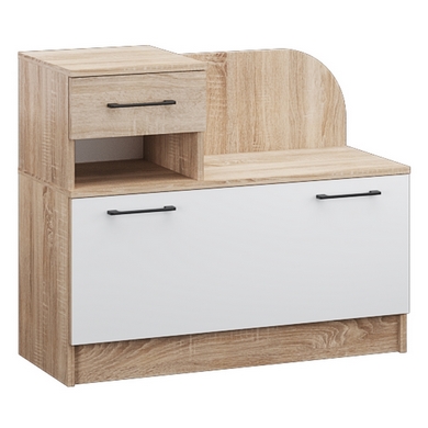 Особенности Тумбы для обуви с полкой Денвер: Тумба под обувь с местом для хранения обуви, ящиком, открытой нишей и сиденьем. Хорошая вместимость. Черные металлические ручки. Разноплановое наполнение.