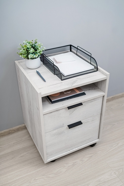 Особенности: Офисная тумба для хранения Флекс 28 оборудована открытой нишей и двумя выдвижными ящиками разных размеров. Ящики оснащены шариковыми направляющими полного выдвижения и тонкими удобными торцевыми ручками. Благодаря колесным опорам тумбу можно без труда передвигать по комнате. Ограждающие бортики по трём сторонам столешницы предотвратят падение предметов. Притопленный цоколь придает мебели легкости и воздушности. Можно компоновать с другими модулями из серии мебели Флекс.