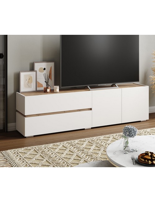 Технические характеристики: Тумба под ТВ Аркон (белый, дуб вотан) - в элегантном дизайне, идеально впишется в любые помещения и создат в них уют. Тумба имеет отсек за распашными створками и два выдвижных ящика. Ящики на шариковых направляющих. Опора комода регулируемая - 2 см.