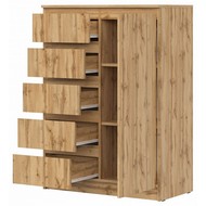 Ширина, см: 83. Высота, см: 114,3. Выступ, см: 43,3. Размер упаковки, (мм): 1170x430x85, 955x485x80. Вес (кг): 58. Компоненты, входящие в комплект: 1 дверца, 2 полки, 5 ящиков. Стиль: модерн. Страна-производитель: Россия. Объем (м3): 0.11. Количество секций для хранения: 5. Основной цвет: разноцветная. Материал фасада: ЛДСП Е1. Материал корпуса: ЛДСП Е1. Тип поверхности корпуса: матовый. Место размещения: Пол. Помещение: Гостиная, Кабинет, Прихожая, Спальня. Гарантия (месяц): 24. Основное помещение: Гостиная. Цвет корпуса: дуб вотан. Цвет фасада: дуб вотан.