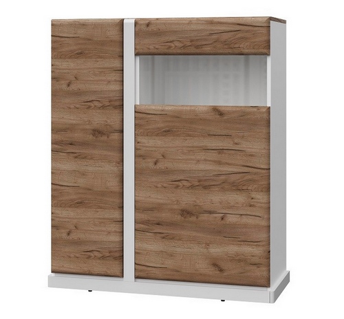 Дополнительно: Тумба высокая с полками и стеклянной вставкой. Каркас выполнен из ЛДСП 16 мм, МДФ 16 мм. Фасад выполнен из МДФ 16 мм. Задняя стенка и дно ящика тумбы выполнены из ДВПО белого цвета.