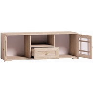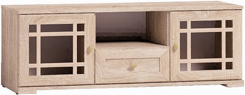 Технические характеристики: Тумба оснащена 2 отделениями с распашной дверью, выдвижным ящиком и открытой нишей. Двери тумбы со стеклянными вставками (стекло тонированное). Ширина центральной ниши 37 см. Размеры выдвижного ящика (ширина-глубина-высота): 36,5 х 35 х 12 см. Выдвижной ящик можно не устанавливать, увеличив тем самым размер центральной ниши (например, под аппаратуру). Выдвижной ящик на шариковых направляющих. Максимальная нагрузка на ящик до 20 кг. Рамочные фасады с раскладкой из профиля МДФ. Поставляется в разобранном виде.