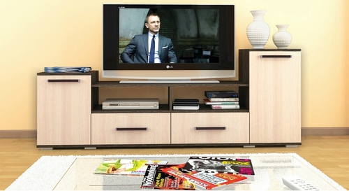 Технические характеристики: ТВ-тумба оснащена двумя секциями с распашной дверью, двумя выдвижными ящиками и двумя открытыми нишами. Поставляется в разобранном виде.