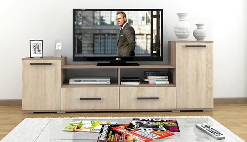 Технические характеристики: ТВ-тумба оснащена двумя секциями с распашной дверью, двумя выдвижными ящиками и двумя открытыми нишами. Поставляется в разобранном виде.