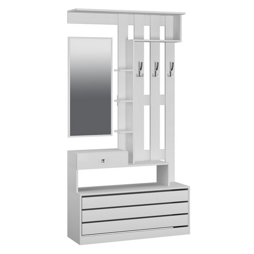 Особенности Центральной секции Ямайка: Содержит нишу для обуви с откидной дверцей, выдвижной ящик для мелочей, открытую вешалку с 3-мя крючками, полку-антресоль, набор открытых полок и зеркало. Ширина в 110 см позволит разместить секцию даже в малогабаритной прихожей.