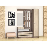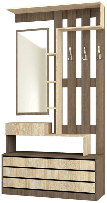 Технические характеристики: Модуль состоит из тумбы, вешалки для верхней одежды, полки для головных уборов, стеллажа и зеркала. Вешалка с тремя крючками. Поставляется в разобранном виде.
