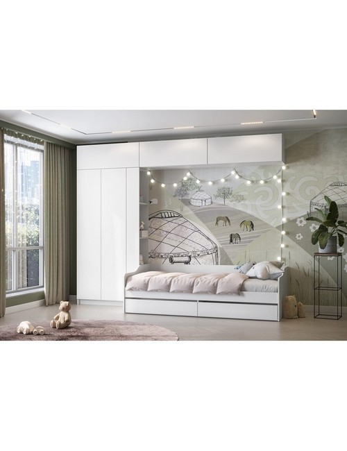 Технические характеристики: Детская Бали комплект 5. Создайте идеальное пространство для вашего ребенка с гарнитуром Бали - гармоничным сочетанием функциональности, комфорта и стиля. Набор включает все необходимое для обустройства уютной и практичной детской комнаты: каркас кровати с выдвижными ящиками, угловое завершение, три навесных шкафа и двухстворчатый шкаф. Вместительные выкатные ящики для организации хранения с прочными роликовыми направляющими для плавного открывания. Шкаф со стационарной штангой для удобного хранения одежды. Рекомендуемая нагрузка на спальное место - до 90 кг. Размер спального места 90*200 см, матрас для кровати и основание в комплект не входят. Детская Бали комплект 5 - это готовое решение для создания комфортной и организованной среды, где каждая деталь продумана для удобства и гармоничного развития вашего ребенка.