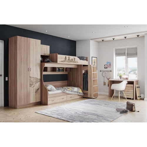 Особенности Детской комнаты Орион: Модульная серия мебели для детской и подростковой спальни. Классические цвета исполнения в сочетании с дизайнерскими изображениями городов мира, нанесенными на фасады методом цветной фотопечати. Кровати комплектуются настилом, матрас приобретается дополнительно.