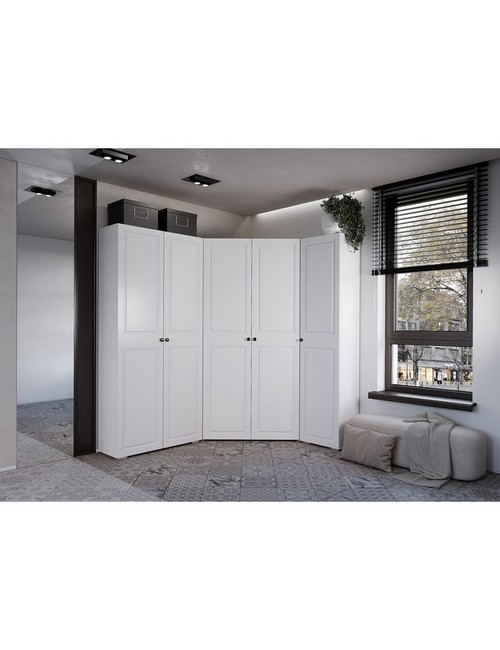 Технические характеристики: Гардеробная Софт комплект 1. Готовый комплект для организации практичной и стильной гардеробной зоны. Включает три ключевых модуля - два угловых шкафа и высокий пенал, - которые вместе создают пространство для хранения одежды, обуви и аксессуаров. Фасады, украшенные декоративной фрезеровкой, добавляют поверхности рельеф и изысканность. Акцентом служат минималистичные металлические ручки и ручки-кнопки черного цвета, которые создают лаконичный контраст со светлым фасадом. Пластиковые подпятники обеспечивают устойчивость и защищают пол от повреждений. Накладные петли на распашных створках. Шариковые направляющие на всех выдвижных ящиках для плавного и тихого хода. Максимальная нагрузка на полку - 10 кг, на штангу - 10 кг, на ящик - 5 кг. Гардеробная Софт комплект 1 - это идеальный баланс дизайна, функциональности и качества для создания упорядоченного и стильного гардеробного пространства.