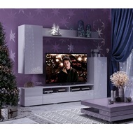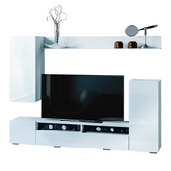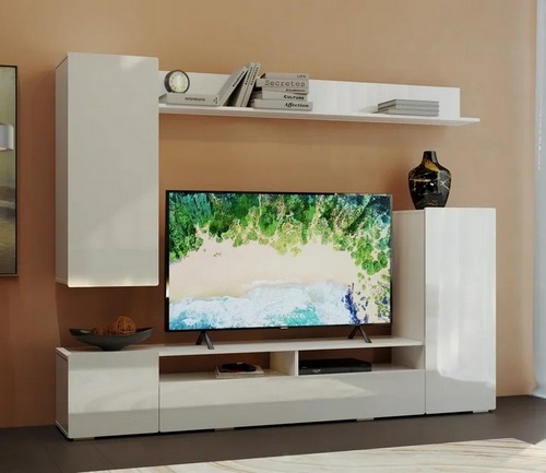Технические характеристики: Белый глянец. Скругленные фасады МДФ. Отсутствие лицевой фурнитуры. Боковые тумбы разделены полкой на два отсека . ТВ-тумба состоит из закрытых мест для хранения и двух открытых полок.