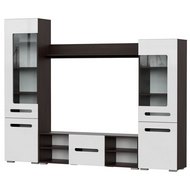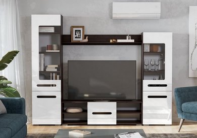 Дополнительно: комплект - ТВ-тумба, два пенала-витрины разной высоты, навесная полка. Модули можно устанавливать раздельно (рекомендуется крепить конструкцию к стене), зеркальная сборка невозможна. Высокий пенал-витрина состоит из двух секций: верхняя комплектуется стеклостворкой и тремя съемными полками, нижняя — глухой створкой и одной съемной полкой. Низкий пенал-витрина состоит из двух секций: верхняя комплектуется стеклостворкой и двумя съемными полками, нижняя — глухой створкой и одной съемной полкой. По краям тумбы открытые ниши со стационарными полками, по середине секция с распашной створкой (навешивается как на левую, так и на правую стороны). Навесная полка крепится к стене на навесы-проушины. Максимально допустимая нагрузка на полку — 5 кг.