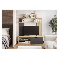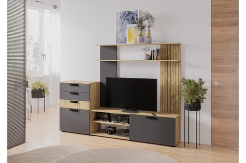 Особенности: Гостиная Мишель комплект 1 - выполнена из высококачественного ЛДСП в цвете крафт с фасадами в глубоком оттенке графит и фотопечатью, имитирующей деревянные рейки. Гостиная Мишель состоит из стильных и функциональных элементов позволяющих с комфортом организовать место для отдыха и приятного времяпрепровождения с семьей и друзьями, а также систему хранения для всех необходимых вещей. Стенка с полкой под ТВ 1 ГС-05 состоит из тумбы под ТВ с открытыми полками и шкафчиком с глухим откидным фасадом и двух навесных полок. Место под ТВ - 75,8х80х33,4 см. Крепление к стене - плоский навес. Комод Мишель тип 1 КМ-12 оснащен тремя ящиками и нижней полкой с откидным фасадом. Ящики оснащены шариковыми направляющими, обеспечивающими плавное и бесшумное открывание. Максимальная нагрузка на полку - 10 кг, на вязку - 10 кг. Створки оснащены накладными петлями. Толщина кромки - 0,45 мм. Прочные регулируемые опоры с высотой 2 см. Ручка АБС пластик, накладная, 15,2 см (общая длина ручки). Поставляется в разборном виде. Инструкция в комплекте.