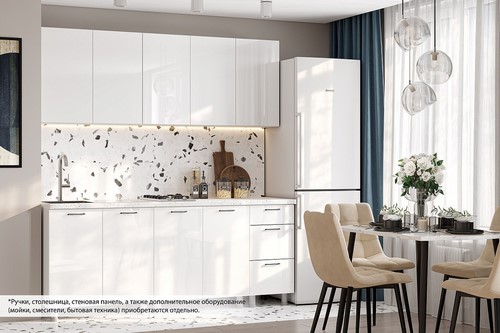 Особенности: Готовая кухня Модерн New (белый/белый глянец) без столешницы станет отличным решением в том случае, если вы ищете функциональный и современный вариант кухонной мебели. Белый цвет зрительно расширяет пространство, благодаря чему кухонный гарнитур прекрасно подойдет для небольшого помещения. Фасады отличаются универсальностью, на них нанесена разметка под ручки с межцентровым расстоянием 128 мм. Обратите внимание, что ручки, толкатели PUSH LATCH, столешница, стеновая панель, а также дополнительное оборудование (мойка, смеситель, бытовая техника) в комплект не входят. Направляющие ящиков: Шариковые Максимальная нагрузка на ящик: 5 кг Максимальная нагрузка на полку: 10 кг Столешница комплектацией не предусмотрена.