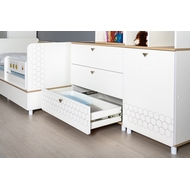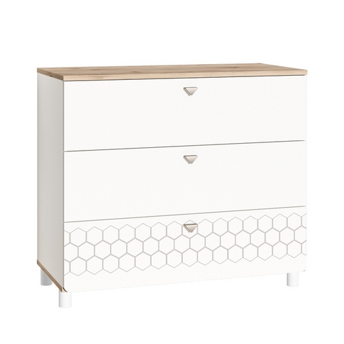 Особенности: Комод Эйп представляет собой стильный и функциональный предмет мебели для детской комнаты, выполненный в современном дизайне, который сочетает практичность и эстетическую привлекательность. Скандинавские мотивы в универсальном цветовом решении делают комод подходящим как для комнаты девочек, так и для мальчиков. Комод состоит из трех выдвижных ящиков и обеспечивает вместительную систему хранения, что позволяет удобно организовать пространство. Комод выполнен в гармоничном сочетании цветов белый шагрень и дуб белый exclusive. Фасады имеют глянцевую поверхность. Ящики оснащены шариковыми направляющими, что обеспечивает легкость и плавность открывания. Комод Эйп изготовлен из высококачественных материалов и комплектующих, что гарантирует его долговечность. Регулируемые опоры позволяют легко адаптировать мебель к неровностям пола, а комплект фурнитуры обеспечивает простоту сборки. Нижний ящик декорирован рисунком сотов, а минималистичные пластиковые ручки добавляют современности и удобства в использовании. Комод Эйп станет отличным выбором для создания функционального и стильного интерьера в детской комнате. Можно компоновать с другими модулями из серии мебели Эйп. Поставляется в разобранном виде.