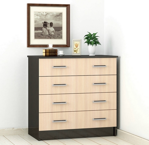Технические характеристики: Комод оснащен четырьмя выдвижными ящиками. Поставляется в разобранном виде.
