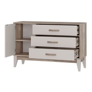 Дополнительно: Комод КМ-12 Скандика имеет 3 выдвижных ящика с плавным механизмом открытия и полкой за фасадом. Створка плотно фиксируется на магнитах. Эмалированные деревянные опоры из бука высотой 20 см. Не универсальная сборка. Шариковые направляющие на ящиках. Максимальная нагрузка на полку – 10 кг, на ящик – 5 кг. Имитация текстуры натурального дерева.