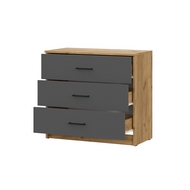 Особенности: Комод Вена КМ 101 представляет собой стильное и функциональное решение для хранения одежды, белья и других вещей. Комод состоит из трех выдвижных ящиков с роликовыми направляющими, которые позволяют им открываться легко и бесшумно. Корпус и фасад выполнен из ЛДСП в сочетании цветов дуб золотой и графит серый. Фасады ящиков оснащены оригинальными и утонченными ручками-скобами. Небольшие опоры без ножек обеспечивают хорошую устойчивость комоду. Реальный цвет товара может отличаться от цвета товара на фотографии. Можно компоновать с другими модулями из серии мебели Вена.