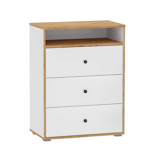 Особенности: Комод Вуди 13.293 представляет собой светлую и аккуратную молодежную мебель, выполненную в сочетании белого цвета и оттенка дуба золотого. Комод является стильным и функциональным дополнением к интерьеру комнаты. Комод включает в себя верхнюю открытую нишу и три вместительных выдвижных ящика, идеально подходящих для хранения одежды, аксессуаров, книг, документов и других предметов. Изготовленный из высококачественных материалов, он обеспечивает надежность и долговечность эксплуатации. Торцы комода обработаны контрастной ПВХ-пленкой толщиной 0,4 мм. Выдвижные ящики оснащены надежными шариковыми направляющими, которые обеспечивают плавное и бесшумное скольжение. Черные пластиковые ручки-кнопки на фасадах выдвижных ящиков добавляют современности и удобства в использовании. Можно компоновать с другими модулями из серии мебели Вуди. Поставляется в разобранном виде.