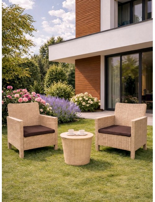 Комплект 2 садовых кресла и столик под ротанг СадКо (бежевый с коричневой подушкой)