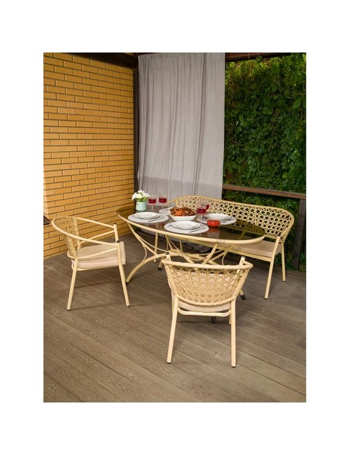 Технические зарактеристики: Комплект мебели 2 стула Латте с подушкой, диван Латте и стол Сочи 1,6 м (бежевый). Элегантный и практичный комплект мебели для создания уютной зоны отдыха в саду, на террасе или в просторной гостиной. В набор входят стильный овальный стол со стеклянной столешницей, мягкий трехместный диван и два стула с подушкой - все, что нужно для комфортного размещения компании. Благородный оттенок искусственного ротанга придает комплекту природную теплоту и визуальную легкость. Изящное плетение создает уютную, расслабленную атмосферу, характерную для эко-стиля, бохо, скандинавского дизайна и современной классики. Стол со стеклянной столешницей визуально облегчает композицию и позволяет любоваться красивым плетением основания. Комплект мебели 2 стула Латте с подушкой, диван Латте и стол Сочи 1,6 м создаст гармоничное и комфортное пространство для отдыха с семьей и друзьями, объединяя природную эстетику и современные технологии.