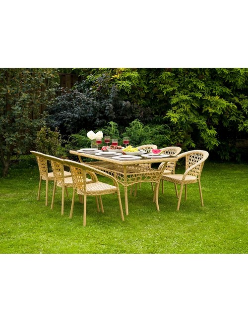Технические зарактеристики: Комплект мебели 6 стульев Мокко и прямоугольный стол Адлер 2 м (бежевый). Элегантный и практичный комплект мебели для создания уютной зоны отдыха в саду, на террасе или в просторной гостиной. В набор входят стильный обеденный прямоугольный стол со стеклянной столешницей и шесть удбных стульев - все, что нужно для комфортного размещения компании. Благородный оттенок искусственного ротанга придает комплекту природную теплоту и визуальную легкость. Изящное плетение создает уютную, расслабленную атмосферу, характерную для эко-стиля, бохо, скандинавского дизайна и современной классики. Стол со стеклянной столешницей визуально облегчает композицию и позволяет любоваться красивым плетением основания. Комплект мебели 6 стульев Мокко и прямоугольный стол Адлер 2 м создаст гармоничное и комфортное пространство для отдыха с семьей и друзьями, объединяя природную эстетику и современные технологии.