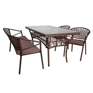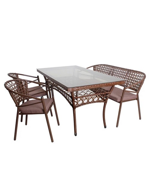 Технические зарактеристики: Комплект садовой мебели стол Адлер 1,6 м, диван и 2 стула Латте с подушкой (коричневый). Обеденный комплект включает в себя стол, два стула и трехместный диван с подушками. Металлический каркас с порошковым покрытием обеспечивает долговечность и устойчивость к коррозии. Искусная оплетка из искусственного ротанга придает комплекту изысканный вид. Столешница из прочного закаленного стекла. Сиденья стульев и дивана с металлической обрешеткой дополнены мягкими подушками из рогожки для комфорта. Идеально подходит для семейных обедов и встреч с друзьями на террасе или в саду. Легкость в уходе и устойчивость к атмосферным воздействиям гарантируют долгий срок службы. Комплект рассчитан на 5 персон, что делает его идеальным для небольших компаний.