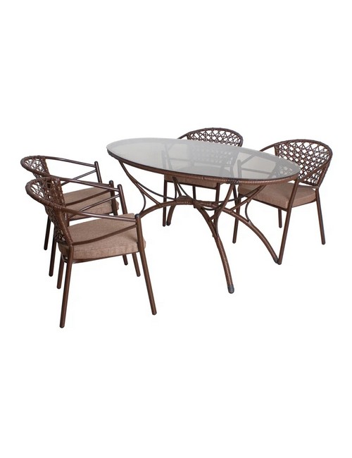 Технические зарактеристики: Комплект садовой мебели стол Сочи и 4 стула Латте с подушкой (коричневый). Комплект состоит из овального обеденного стола Сочи и четырех стульев Латте с подушкой. Металлический каркас с порошковым покрытием обеспечивает долговечность и устойчивость к коррозии. Искусная оплетка из искусственного ротанга придает комплекту изысканный вид. Столешница из прочного закаленного стекла. Идеально подходит для семейных обедов и встреч с друзьями на террасе или в саду. Легкость в уходе и устойчивость к атмосферным воздействиям гарантируют долгий срок службы.