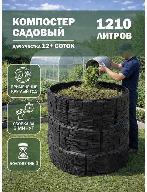 Технические характеристики: Компостер садовый усиленный с люком Бастион 1210 л (черный). Вместительный и прочный садовый компостер объемом 1210 литров для эффективной переработки органических отходов в натуральное удобрение. Усиленная конструкция с ребрами жесткости, двумя дверцами-люками и надежной крышкой обеспечивает долговечность, удобство загрузки и извлечения компоста. Рельефные панели и ребра жесткости по всей конструкции обеспечивают высокую прочность и устойчивость к нагрузкам от грунта и компостной массы. По 6 стяжек вверху и внизу надежно фиксируют панели, придавая компостеру дополнительную жесткость и предотвращая деформацию. Люк в нижней части компостера позволяют легко извлекать готовый компост, не разбирая всю конструкцию. Крышка позволяют регулировать поступление воды для поддержания оптимальной влажности, два фиксатора надежно закрепляют крышку, предотвращая ее смещение и сдувание ветром, удобные ручки для легкого снятия и установки. В набор входят все необходимые элементы для сборки: секции стенки - 16 шт., секции с рамкой для дверцы - 2 шт., дверцы - 2 шт., верхняя стяжка - 6 шт., нижняя стяжка - 6 шт., секции крышки с отверстиями под фиксатор - 6 шт., фиксатор крышки - 2 шт. Компостер садовый усиленный с люком Бастион 1210 л - это профессиональное решение для переработки органических отходов, обеспечивающее получение качественного компоста при минимуме усилий.