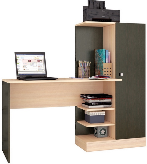 Технические характеристики: Стол оснащён шкафчиком и двумя полками под столешницей. Стол можно использовать как письменный или компьютерный. Внутри шкафа - три полки, которые образуют четыре ниши для хранения. Поставляется в разобранном виде.