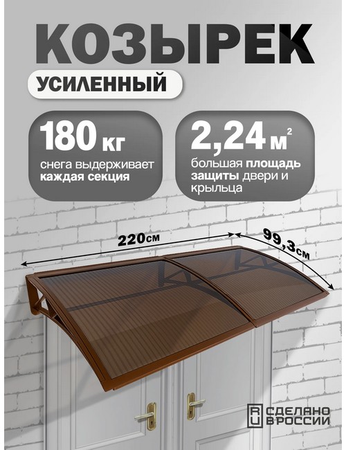 Технические характеристики: Козырек-навес защитный усиленный двойной (коричневый, темный). Надежный и стильный козырек из поликарбоната для защиты входной двери, крыльца и порога от дождя, снега и солнечных лучей. Модель с пластиковым каркасом отличается высокой прочностью, простым монтажом и способностью выдерживать значительные нагрузки. Поликарбонат толщиной 6 мм - ударопрочный, легкий, устойчивый к градам и механическим повреждениям. Не желтеет со временем, хорошо пропускает свет, но защищает от ультрафиолета. Пластиковый каркас - легкий, устойчивый к коррозии, не требует покраски. Выдерживает нагрузку до 180 кг на секцию - устойчив к снеговым нагрузкам и воздействию внешней среды. Конструкция разработана для быстрой и легкой установки, все крепления в комплекте. Козырек-навес защитный усиленный двойной обеспечит надежную защиту входной зоны и придаст фасаду завершенный, современный вид.