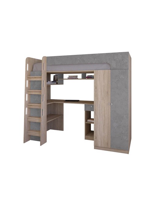 Технические характеристики: Кровать чердак Астра 10 (сонома, железный камень). Умная конструкция кровати-чердака Астра 10 для детской комнаты, которая помогает организовать пространство с максимальной пользой. Вся нижняя зона превращена в многофункциональный блок: просторный шкаф и удобное рабочее место с компьютерным столом. Это удачная альтернатива двухъярусной кровати, где первый уровень полностью занят системой хранения и учебной зоной. Кровать на верхнем ярусе с защитными бортиками. Выдвижной ящик на роликовых направляющих. Максимальная нагрузка на спальное место - 100 кг. Кровать-чердак Астра 10 — это продуманное решение для небольших помещений, где важно совместить спальное место, систему хранения и уголок для учебы без потери комфорта.