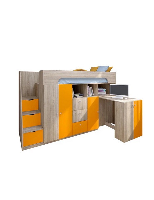Технические характеристики: Кровать чердак Астра 11 (сонома, оранжевый). Умная конструкция кровати-чердака Астра 11 для детской комнаты, которая помогает организовать пространство с максимальной пользой. Спальное место расположено на удобной высоте, а под ним скрывается практичная рабочая зона со встроенными системами хранения. Кровать на верхнем ярусе с защитными бортиками, выдвижной письменный стол, который легко убирать при необходимости, удобная лестница-комод с ящиками разной глубины для дополнительного хранения. Выдвижной ящик на роликовых направляющих. Кровать-чердак Астра 11 — это продуманное решение для небольших помещений, где важно совместить спальное место, систему хранения и уголок для учебы без потери комфорта.