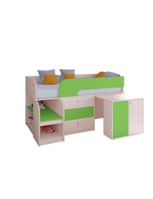 Технические характеристики: Кровать чердак Астра 9 V7 (дуб молочный, салатовый). Игровая и функциональная кровать чердак Астра 9 V7, создающая идеальное пространство для ребенка. Сочетает безопасность, оригинальный дизайн и продуманную организацию места для сна, игр и хранения. Все кромки обработаны, отсутствуют острые углы, установлен защитный бортик. Удобные полки для книг и игрушек. Направляющие ящика - роликовые. Максимальная нагрузка на спальное место - 100 кг. Кровать чердак Астра 9 V7 - идеальное решение для детской комнаты, где важны безопасность, комфорт и рациональное использование пространства. Варианты цвета фасадов: дуб шамони, орех, оранжевый, голубой, салатовый, розовый, дуб молочный, венге. Для уточнения деталей рекомендуем проконсультироваться с нашими специалистами.