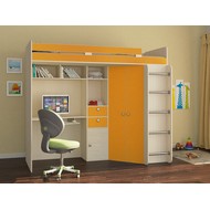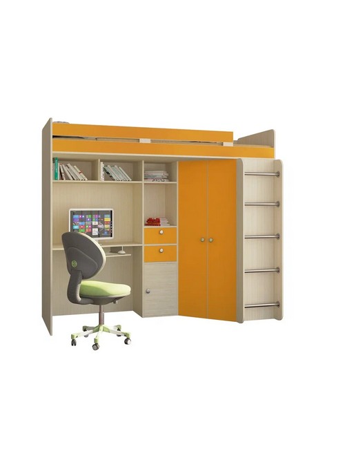 Технические характеристики: Кровать чердак Астра (дуб молочный, оранжевый). Умная конструкция кровати-чердака Астра для детской комнаты, которая помогает организовать пространство с максимальной пользой. Вся нижняя зона превращена в многофункциональный блок: с одной стороны — просторный угловой шкаф, с другой — удобное рабочее место с компьютерным столом. Это удачная альтернатива двухъярусной кровати, где первый уровень полностью занят системой хранения и учебной зоной. Кровать на верхнем ярусе с защитными бортиками. Два выдвижных ящика на роликовых направляющих. Максимальная нагрузка на спальное место - 100 кг. Кровать-чердак Астра — это продуманное решение для небольших помещений, где важно совместить спальное место, систему хранения и уголок для учебы без потери комфорта.